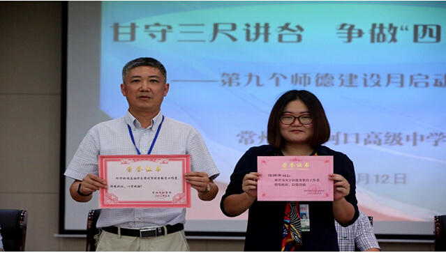 今年9月1 0日是全国第32个教师节,结合师德建设月活动,李秀敏副校长首先宣读了市、区、镇各级优秀教师的表彰决定,并由校领导为各位优秀教师颁奖,号召全体教师要以先进教师为榜样,进一步增强责任感和使命感,提高自身素质,敬业爱岗、教书育人、为人师表, 积极参加师德建设月各项活动,以出色的工作、高尚的师德塑造教师的美好社会形象。