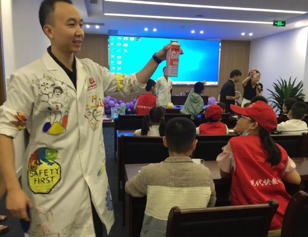 小记者们期待的魔幻实验——“火焰掌”来啦!勇敢的小记者主动要求上台参与实验。