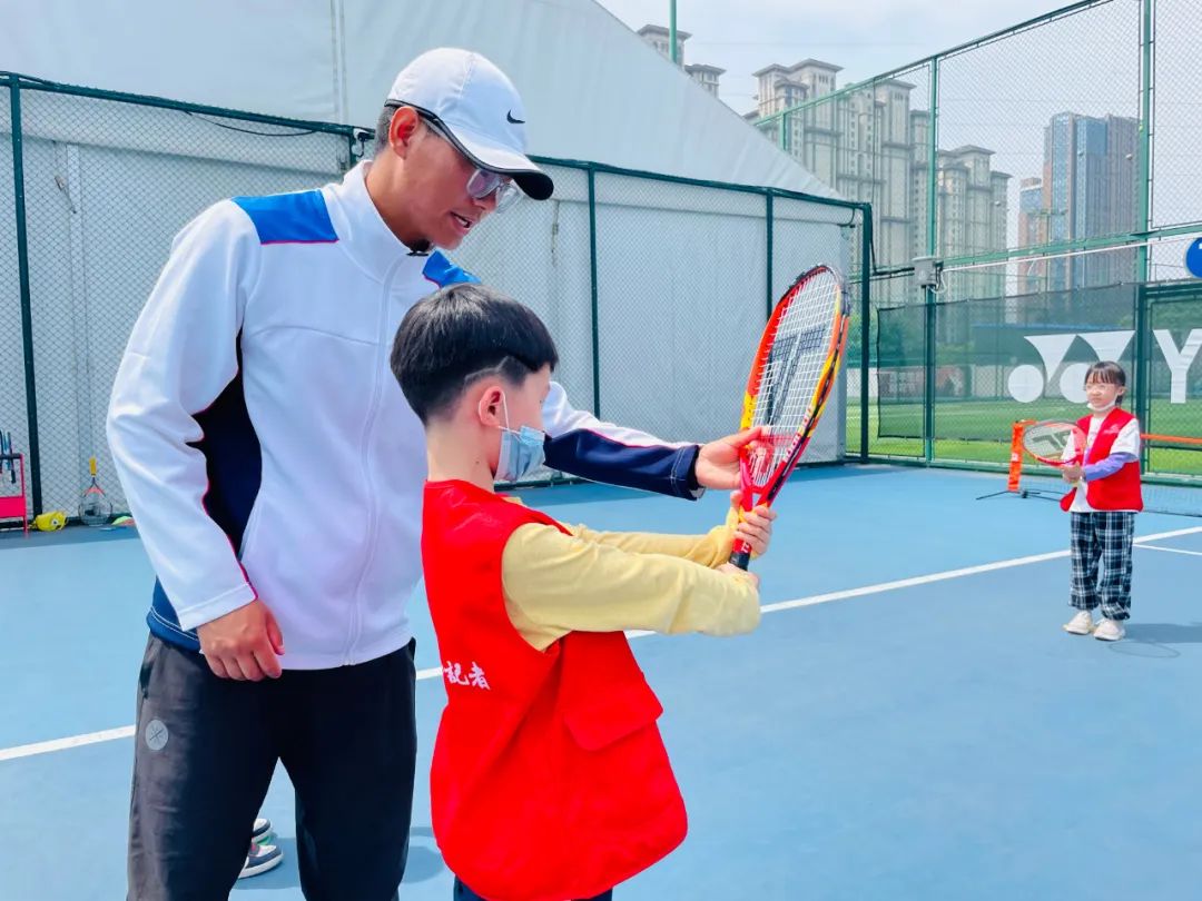 对网球有了初步的认知后,小记者们能否单独完成一个完整的击球动作呢?教练一对一耐心指导,小组内也互相学习,交流经验。