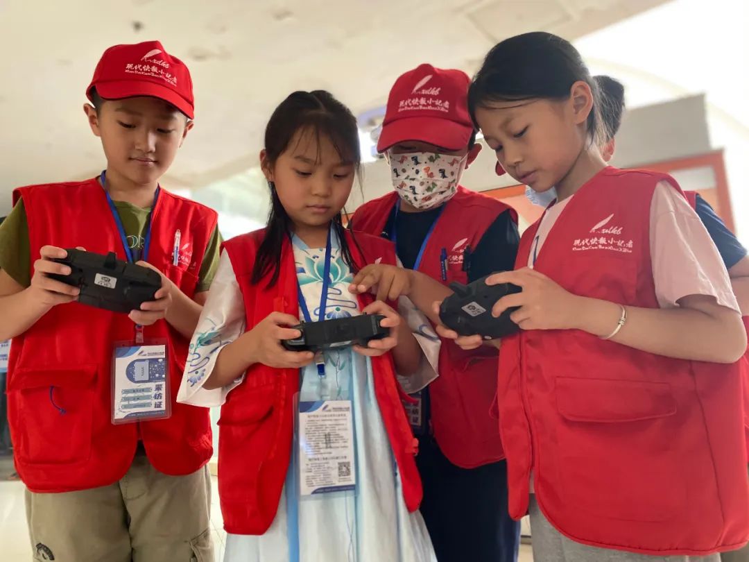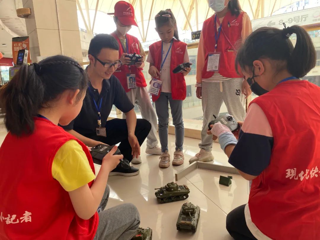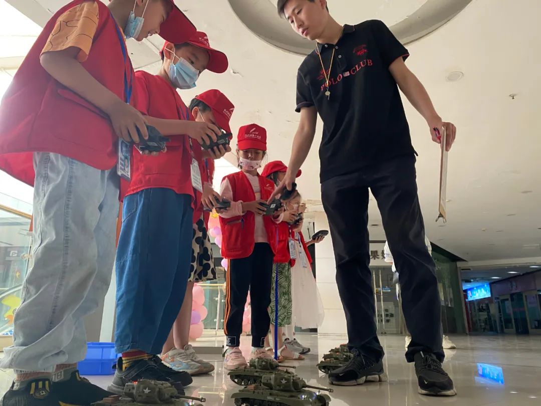 小记者纷纷走上自主搭建的赛场,小组成员进行任务分解,每一个少年心中的国防科技梦被点燃,大家启动手中遥控,团队协作开展坦克模型PK赛。
