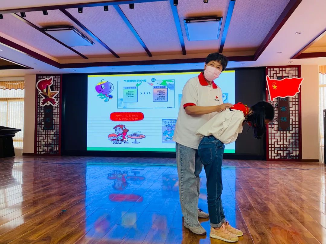 许老师现场为小记者们指导异物气道梗阻时的急救手法,随后小记者们上台进行实践体验,在许老师的协助下大家基本掌握了气道梗阻的救助动作要领。