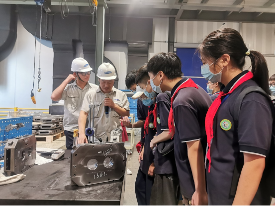 第一站是铸造车间,透过电子屏,同学们了解到车间的运作情况,叮叮当当的碰撞声夹杂着耀眼的红光,这座宏大而热烈的车间吸引着同学们去一探究竟。走进车间,在上千摄氏度的高温之下,百炼钢也化作绕指柔,再倒入模具,变成我们想要的形状。大家恍然大悟,原来钢铁是这样炼成的!即使是在盛夏,工人们也顶着空气中的火热灰尘和刺耳的电机轰鸣声,热火朝天地工作着。