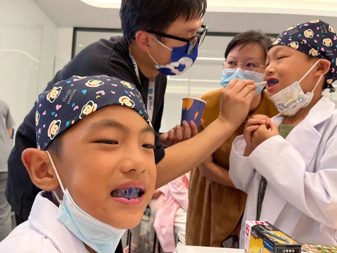 小记者扮演吸血鬼,医护人员用牙菌斑显色剂涂抹在牙齿表面,在试剂的作用下,牙齿表面的细菌就会呈现血红色了。小记者们都惊呆了,原来自己的刷牙方法不正确,牙齿就刷不干净了。