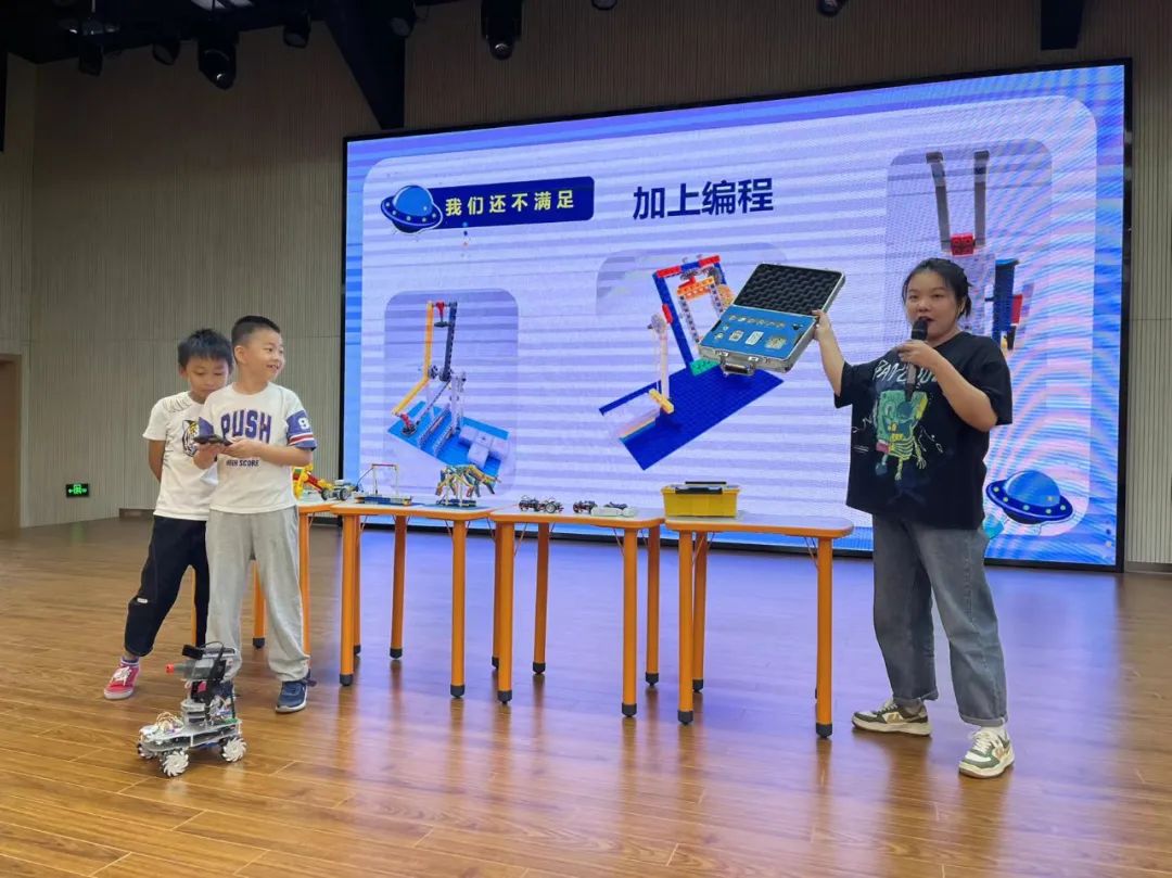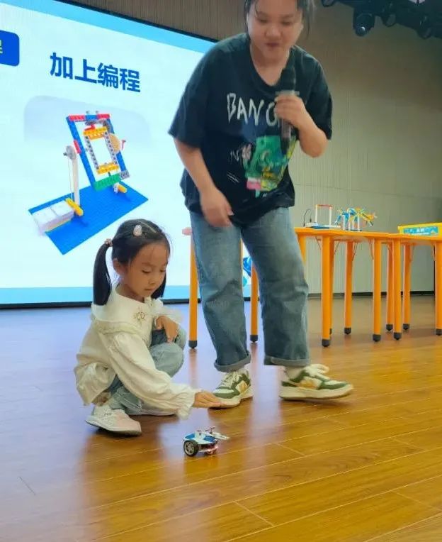 编程老师自主研发的“水弹车”一上场,就受到了小记者们的喜爱,全场一片沸腾。老师邀请部分小记者上台体验,模拟操控“水弹车”前进、后退和发射水弹(出于安全考虑,车上没有装水),小记者们非常开心。