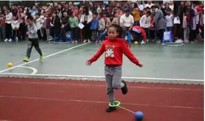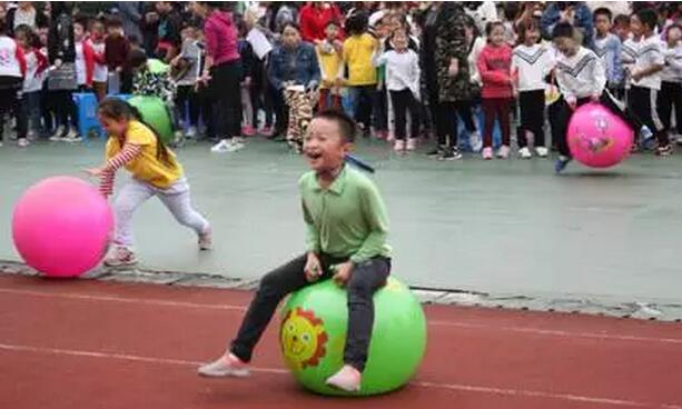 一个个圆圆的跳跳球在同学们脚边不停的转呀转呀,同学们个个乐得笑个不停,旋转的跳跳球就像是一个个快乐的音符围绕在学生周围。