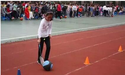 接下来进行的是双腿夹球接力,这项比赛不仅考验的是学生的团结协作能力,同时也考验了学生的顽强意志力。圆滚滚的篮球在移动的过程中总是不慎掉下,但我们的小选手们毫不退缩,迎难而上,始终坚持不懈。小小的身躯爆发着强大的意志力,展示着中国少年之强。底下呐喊的同学在这种精神的感染下,鼓舞声越加响亮。