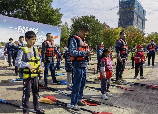 活动现场一开始教练带领大家在岸边学习正确的握桨姿势,掌握前进、倒退桨法。在练习划桨的同时,专业教练介绍道:"赛艇运动是一项全身运动,需要同时调动背部、臀部、手臂、腿部等各大肌肉群,多人配合时很考验队伍的协作能力。'