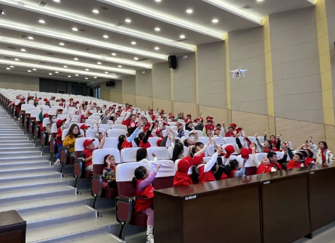 在无人机老师的操作下,小记者与教师代表亲身感受了无人机的起飞、行进、翻转、返回、着陆这一系列的飞行动作,小记者们激动地向无人机挥手示意。