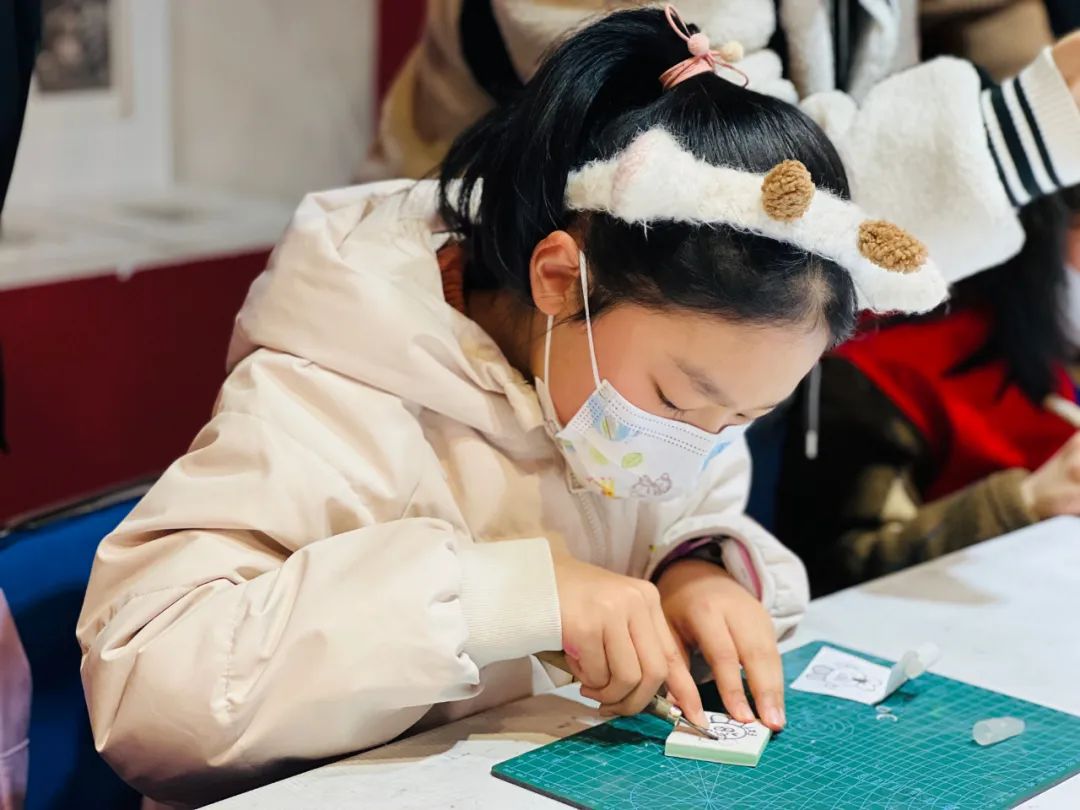 制作过程中,小记者们在谢老师耐心细致教学下,从设计、描绘到雕刻,在到最后的拓印,很快就完成了兔年版画作品。