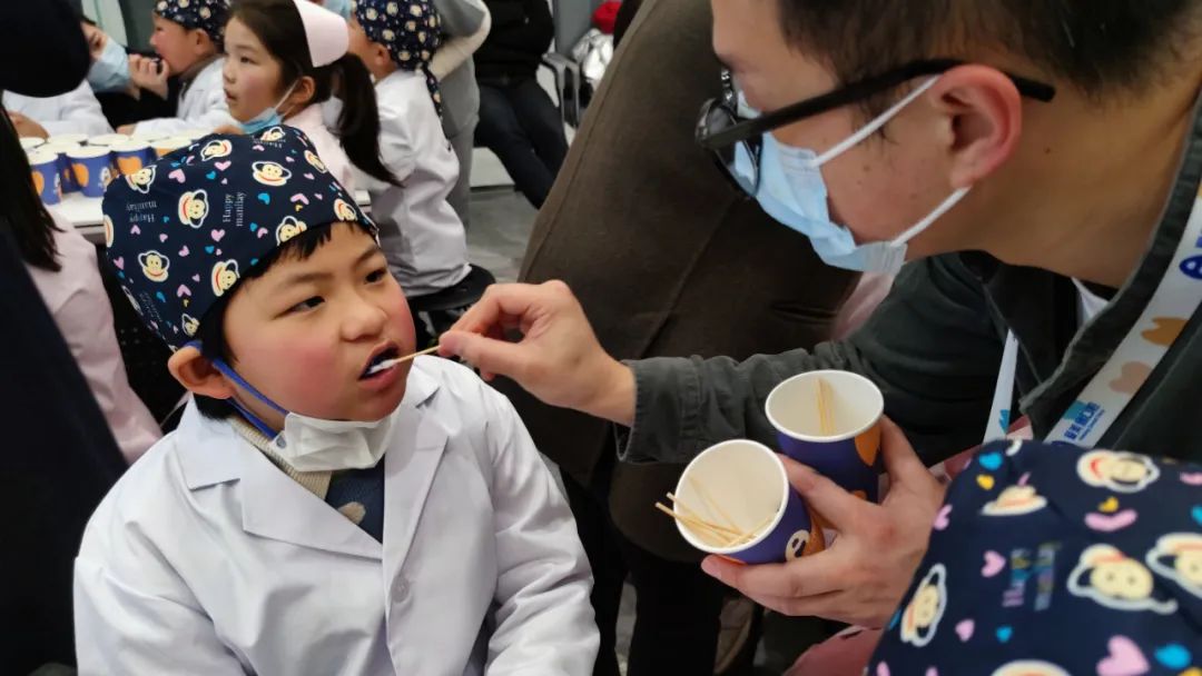 工作人员为小记者涂抹药剂,检测牙齿是否干净并通过教具学习如何正确使用牙线。