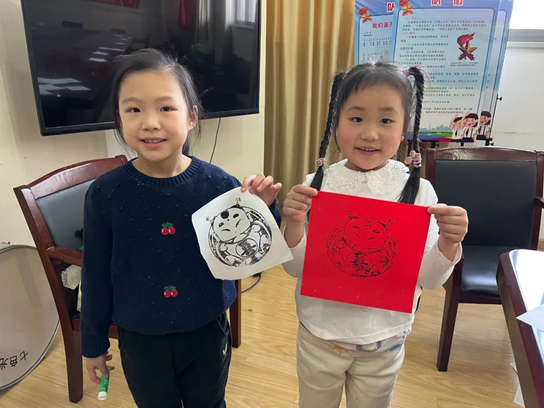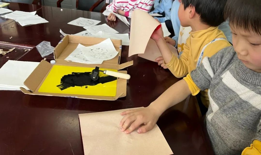 在杨老师的现场演示和指导下,孩子们有模有样地用墨辊蘸取黑色颜料在雕版上均匀滚动,再将宣纸轻轻覆盖在刷好的雕版上,一只手按住宣纸,另一只手拿海绵头,在纸上轻轻按压,使宣纸和雕版之间更贴合;然后用马莲在宣纸上轻轻的移动,让宣纸充分吸收油墨;最后揭开宣纸,作品就完成啦。
