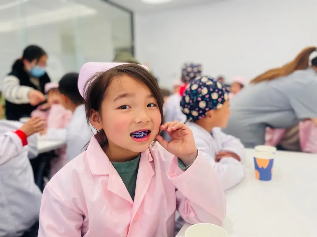 接着,医师们为小记者涂抹药剂,检测牙齿是否干净并通过教具学习如何正确使用牙线。