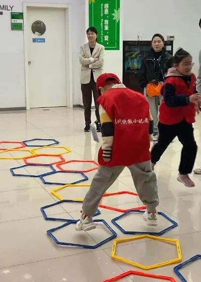 接着小记者们分为两组,与不同年龄段的“星娃”一起做游戏和比赛,跳格子、套圈圈、打羽毛球,在游戏和互动中,帮助他们成长。