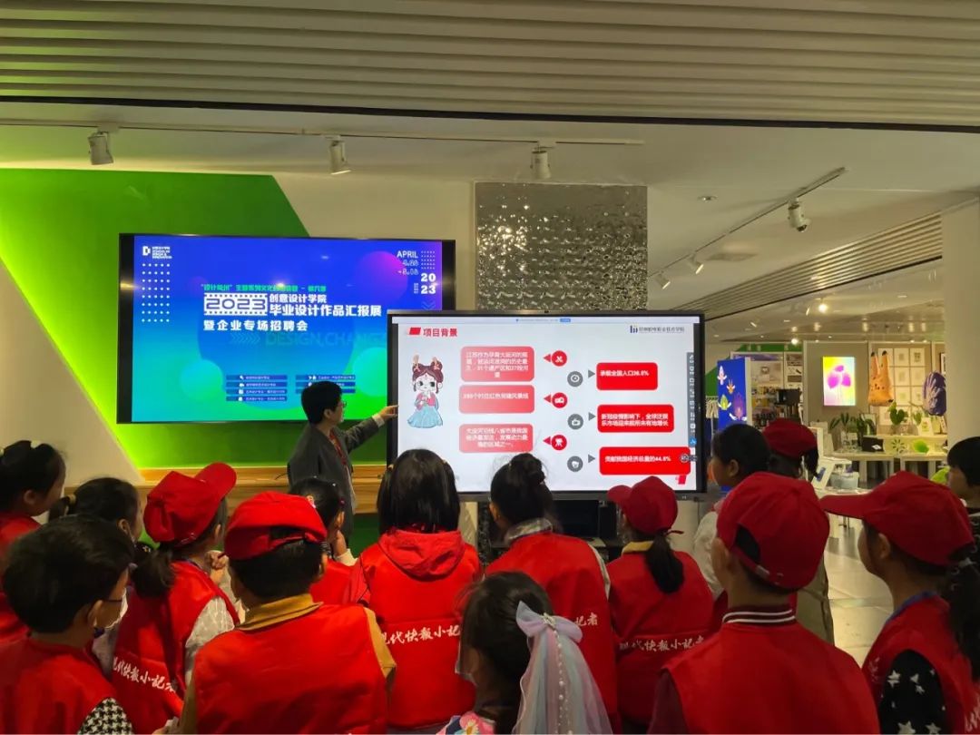 为帮助小记者深入了解家乡运河文化,领略非遗无穷魅力,五一期间,现代快报小记者工作室邀请常大附小、怀德苑小学、湖塘桥第二实验小学部分小记者,走进常州机电职业技术学院创意设计学院,在宗怡老师(创意设计学院党总支副书记)和祁峥老师(大运河项目主创老师)的带领下,参观大学生毕业设计作品展,开启研学之旅。