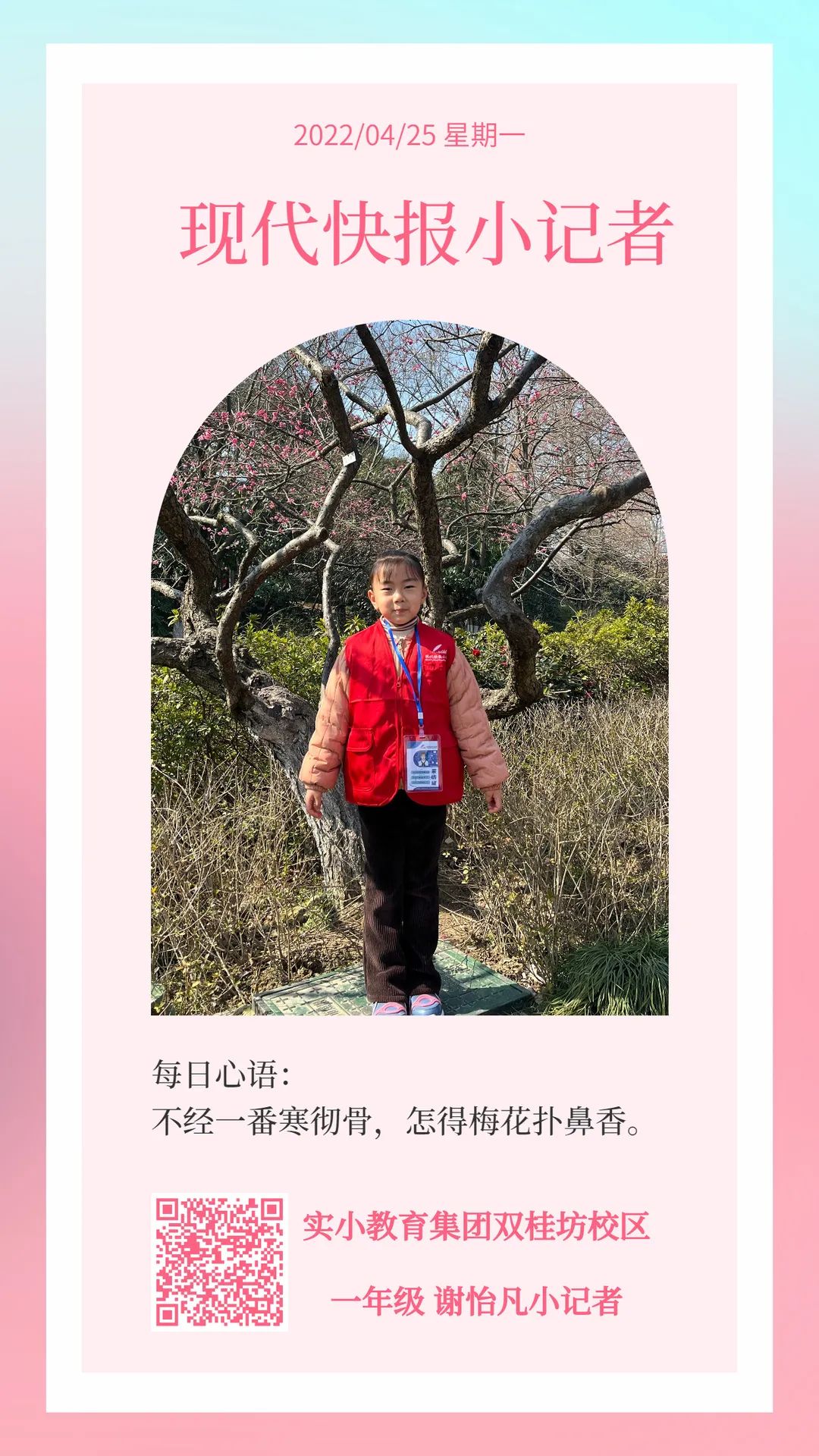 今天的主角是来自实小教育集团双桂坊校区的谢怡凡小记者。“不经一番寒彻骨,怎得梅花扑鼻香”是她最喜爱的话语。