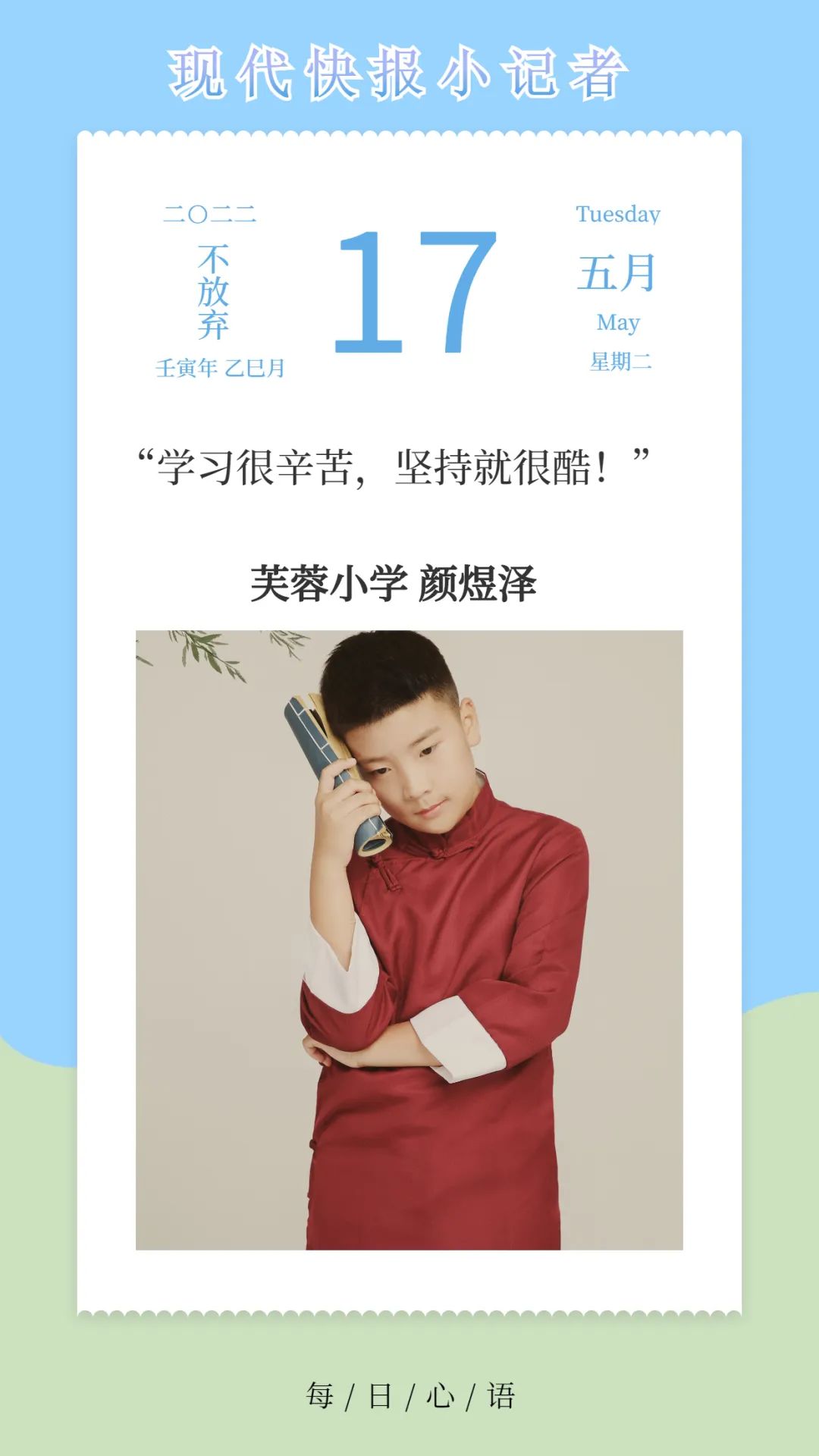 颜煜泽小记者,你是爱读书的智慧小少年。你最喜欢的一句话是“学习很辛苦,坚持就很酷”,可见你是一位热爱学习、无畏困难的小记者,为你点赞。快报小记者工作室祝你以书为友,做贯通古今之人。读万卷书,行万里路。以青春之我,逐华夏之阳。
