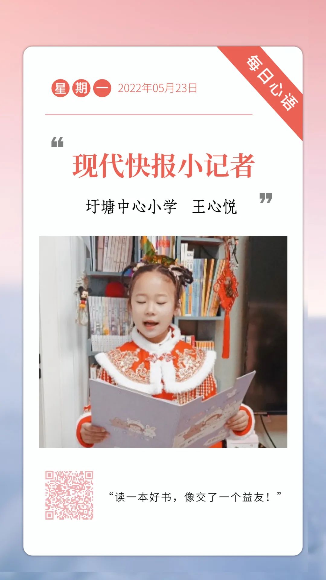 今天的小主人公是来自圩塘中心小学的王心悦小记者。她最喜爱的一句话是:“读一本好书,像交了一个益友!”
