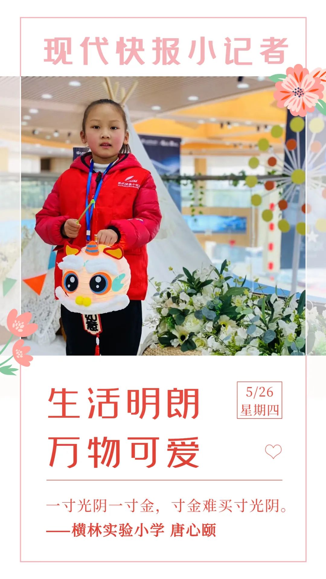 今天的小主人公是来自横林实验小学的唐心颐小记者。她最喜爱的一句话是:“一寸光阴一寸金,寸金难买寸光阴。”