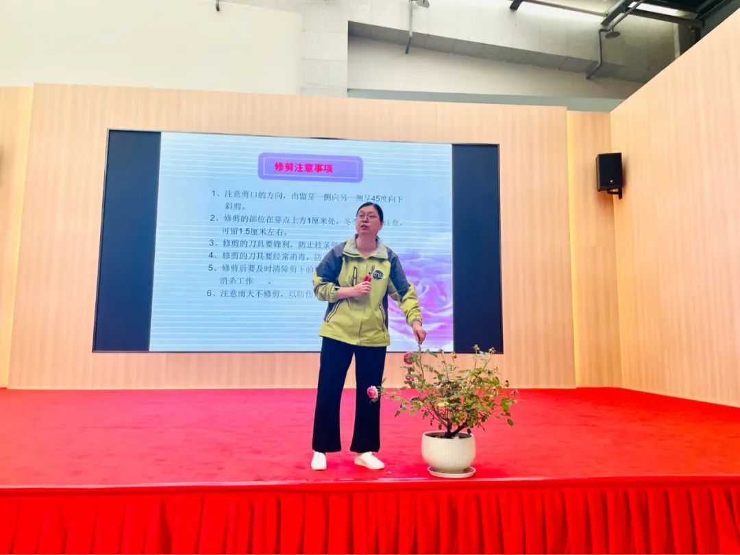家居月季如何养护与管理呢?支老师为大家讲解月季需要注意的温度、水分、土壤、修剪、病虫害防治等方面,并现场演示如何剪枝。