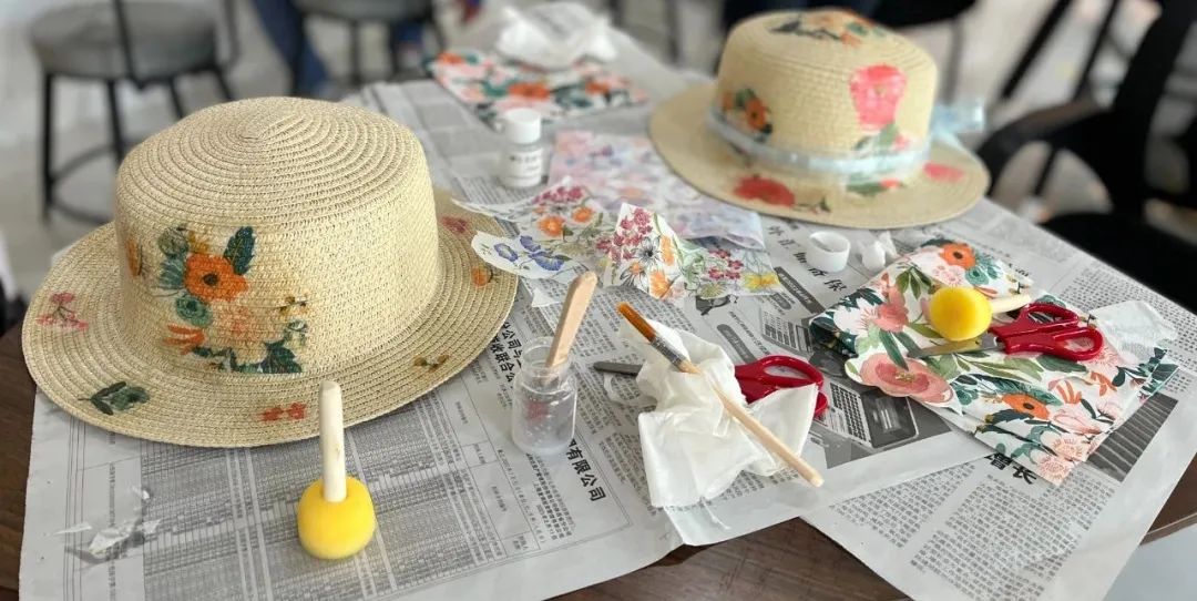 在老师的指导下小记者们按自己的喜好剪下所需要的图案,粘贴到草帽上,刷上了一层“蝶古巴特”专用胶水,并将事先剪好的图案贴在包上,一款款独一无二的艺术草帽便完成了。