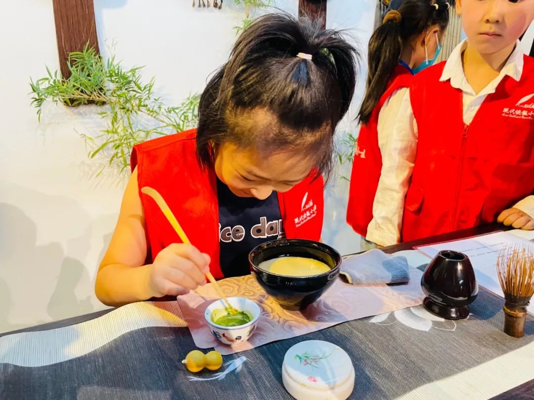 “茶道起源于中国……”活动伊始,老师向小记者们介绍茶的起源与历史文化,大家积极互动,踊跃发言。学习了中国茶知识,小记者们迫不及待地想要开始“点茶”体验。老师带领大家认识点茶工具:茶筅、茶针、茶粉等,耐心教学如何使用。