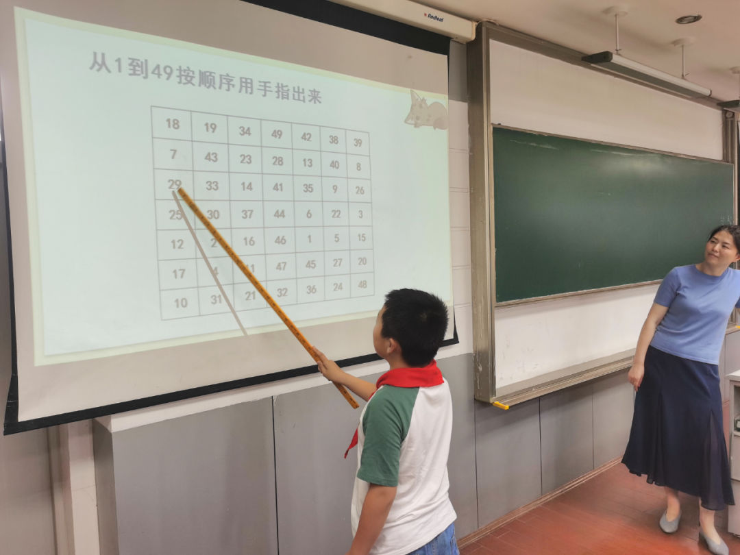 小记者在郭老师的指导下进行舒尔特方格训练。舒尔特方格训练(Schulte Table Training)是一种经典的视觉训练法,旨在通过提高注意力和反应速度来提高认知能力。这种训练法是由德国心理学家W.Schulte于1927年提出,经过多年的实践和研究,已经成为了一种被广泛接受的有效训练方法。