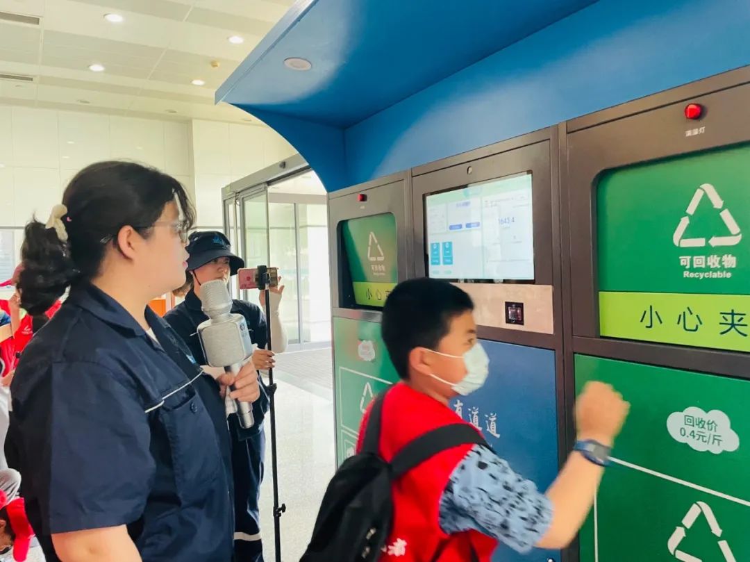 江苏道胜市容的讲解员热情接待了来访小记者们。“智能可回收箱的主要功能是回收可回收物,在箱子完成称重后会以现金方式返现给用户……”讲解员向小记者们介绍智能可回收箱,大家纷纷上前体验。