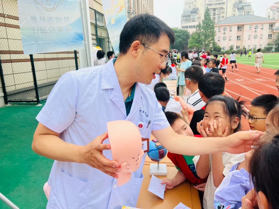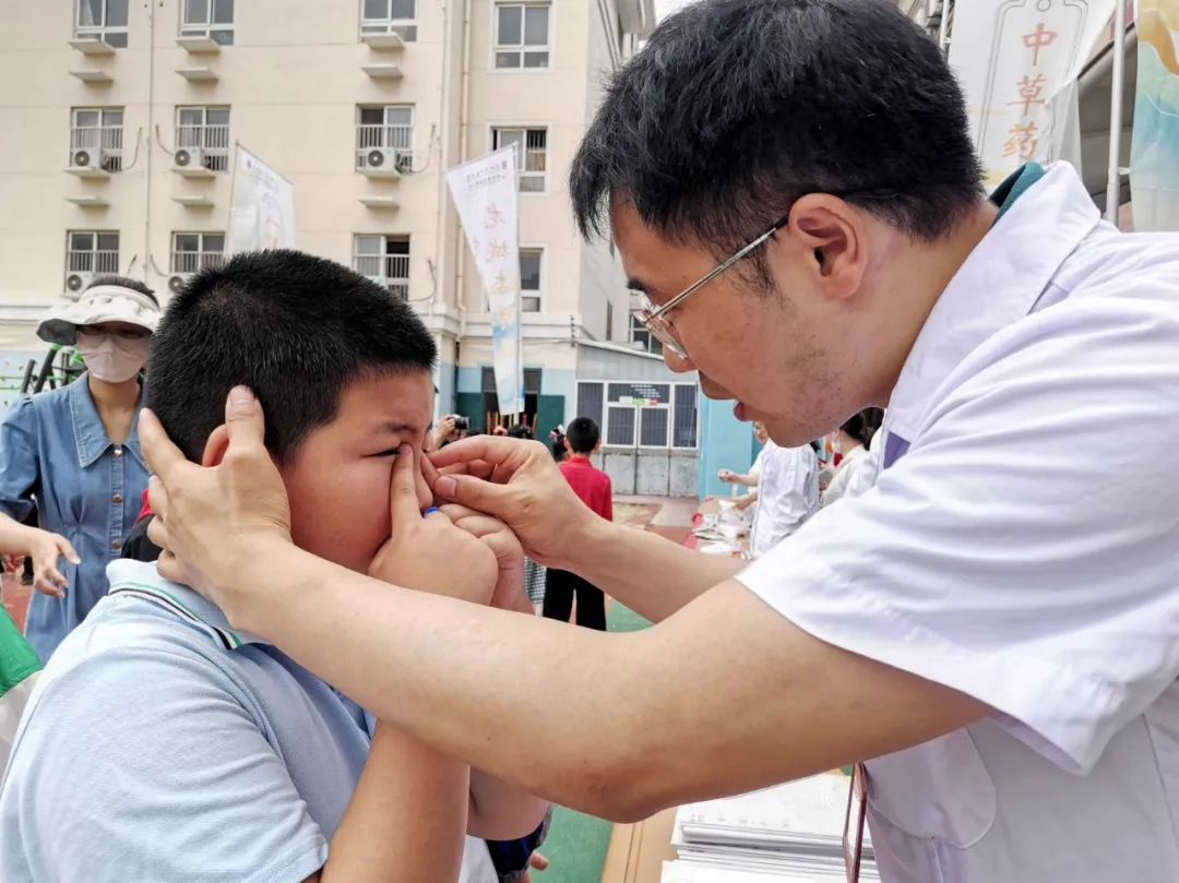 操场上一个摊位前挤满了小记者,引人注目。常州市中医医院眼科主治医师唐睆一边科普一边演示,通过两种简便取穴方式教大家找睛明穴,并进行按摩,可以起到缓解眼部疲劳,预防近视的功效。跟随着唐医生的讲解示范,许多小记者都轻松地学会了一些简单实用的穴位按摩小技巧。