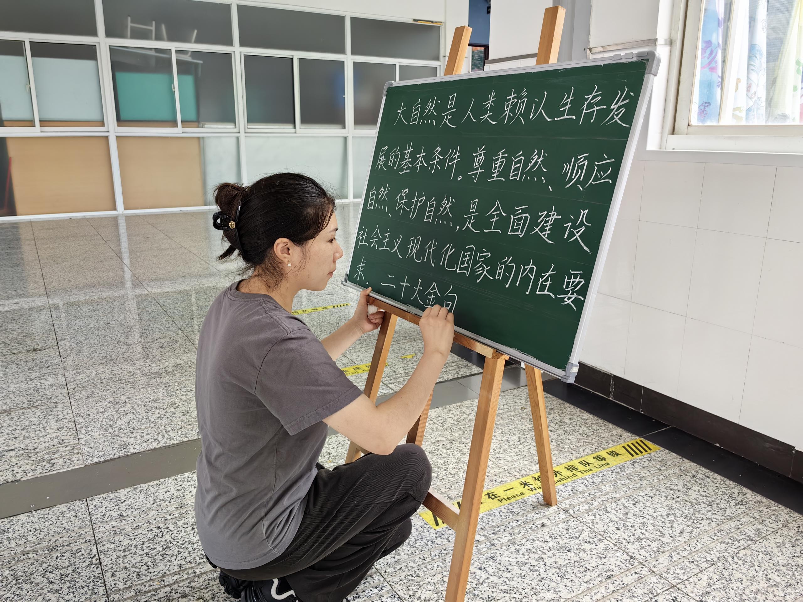 最后,全体党团员教师进行二十大金句粉笔字书写比赛,参赛教师凝神运气,认真书写、边写边思,既锻炼了基本素养,也将二十大报告精髓领悟于心。