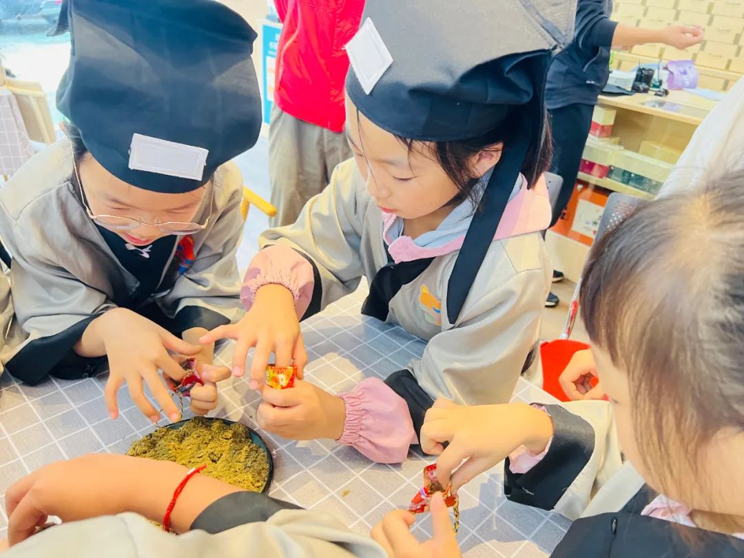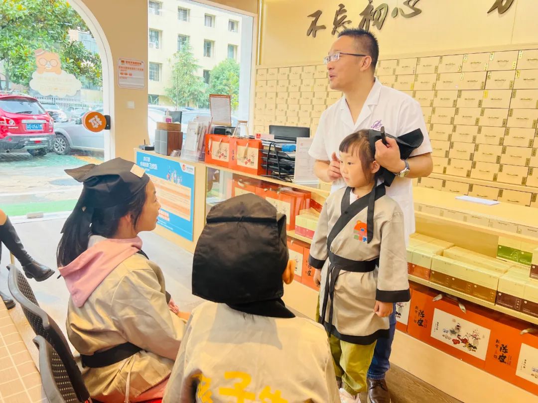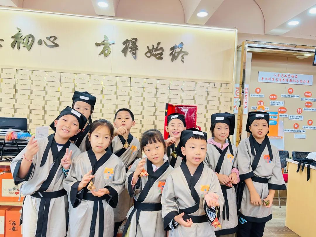 小记者们换上汉服,仿佛穿越了时光,化身为一名名小药师,开始今天的医药知识学习之旅。