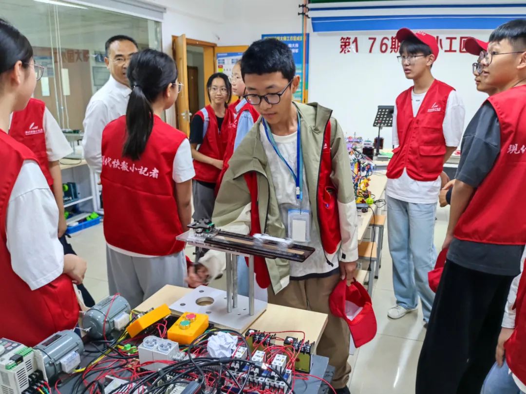 5月24日上午,小河中学40余名优秀学子走进常州信息职业技术学院,走进江苏省科普教育基地,嵇明军技能大师工作室,开启了一场沉浸式机电科技研学之旅。通过此次“大国小工匠‘小鲁班’体验大学校园”暨2025年职业教育活动周主题公益活动,同学们在嵇明军教授及学生志愿者的带领下,亲身感受机电一体化技术的魅力。
