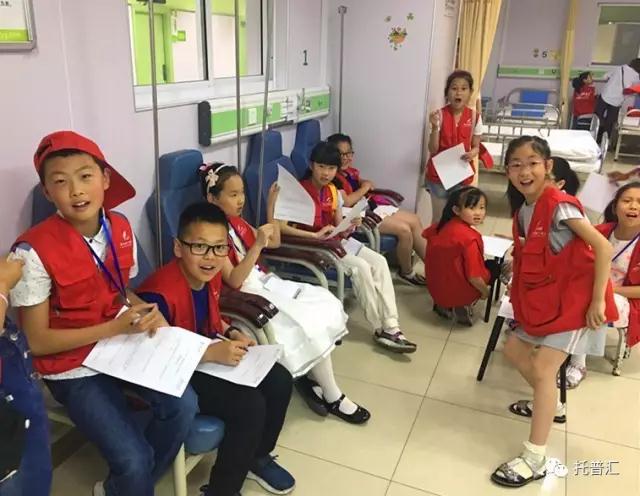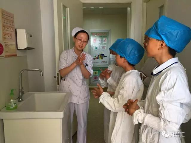 另一组小记者来到输液室,观察医护人员的相关工作并手舞足蹈地提出自己的问题