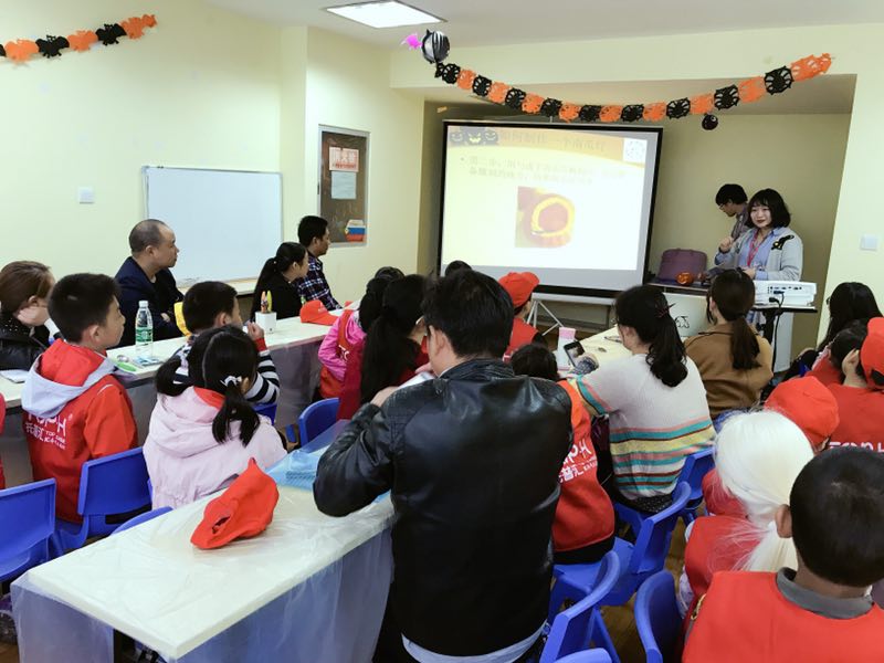 老师给小记者们介绍万圣节这个节日的来由,并教小记者如何制作南瓜灯