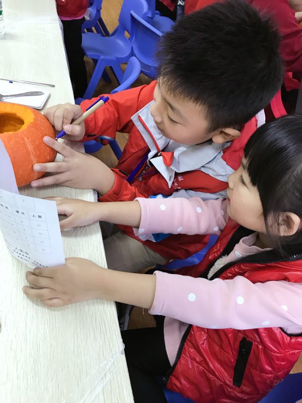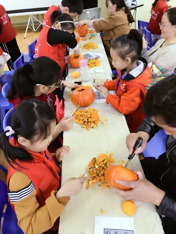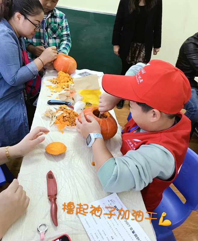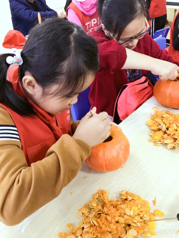 终于轮到小记者们自己动手啦,把精心设计的图案雕刻在南瓜上,制作属于小记者自己风格的万圣节南瓜灯