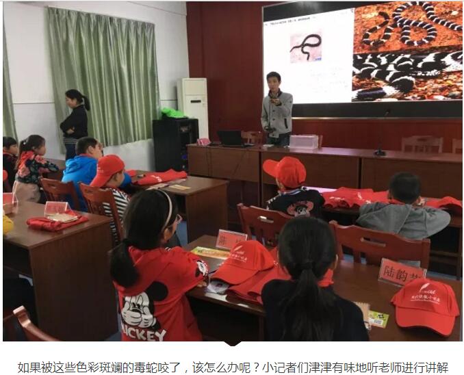 11月10日下午,在快报小记者工作室的组织安排下,自然有意思科学探索馆的自然科学老师来到郑陆实验学校和芙蓉小学,为小记者们带来一场毒蛇鉴别与救治方法的培训讲座。