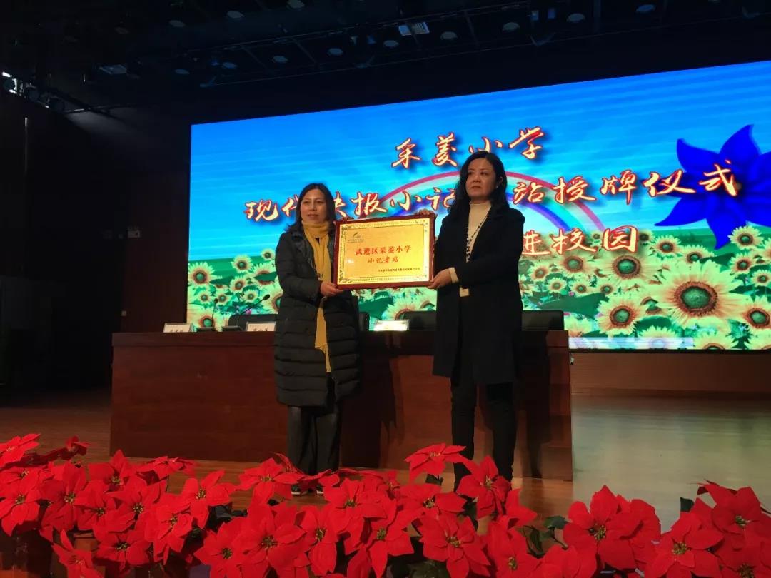 采菱小学副校长周小萍(左)接下快报小记者站铜牌