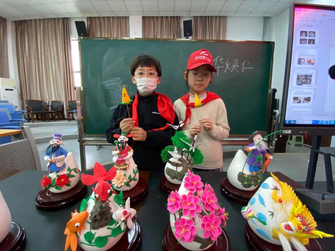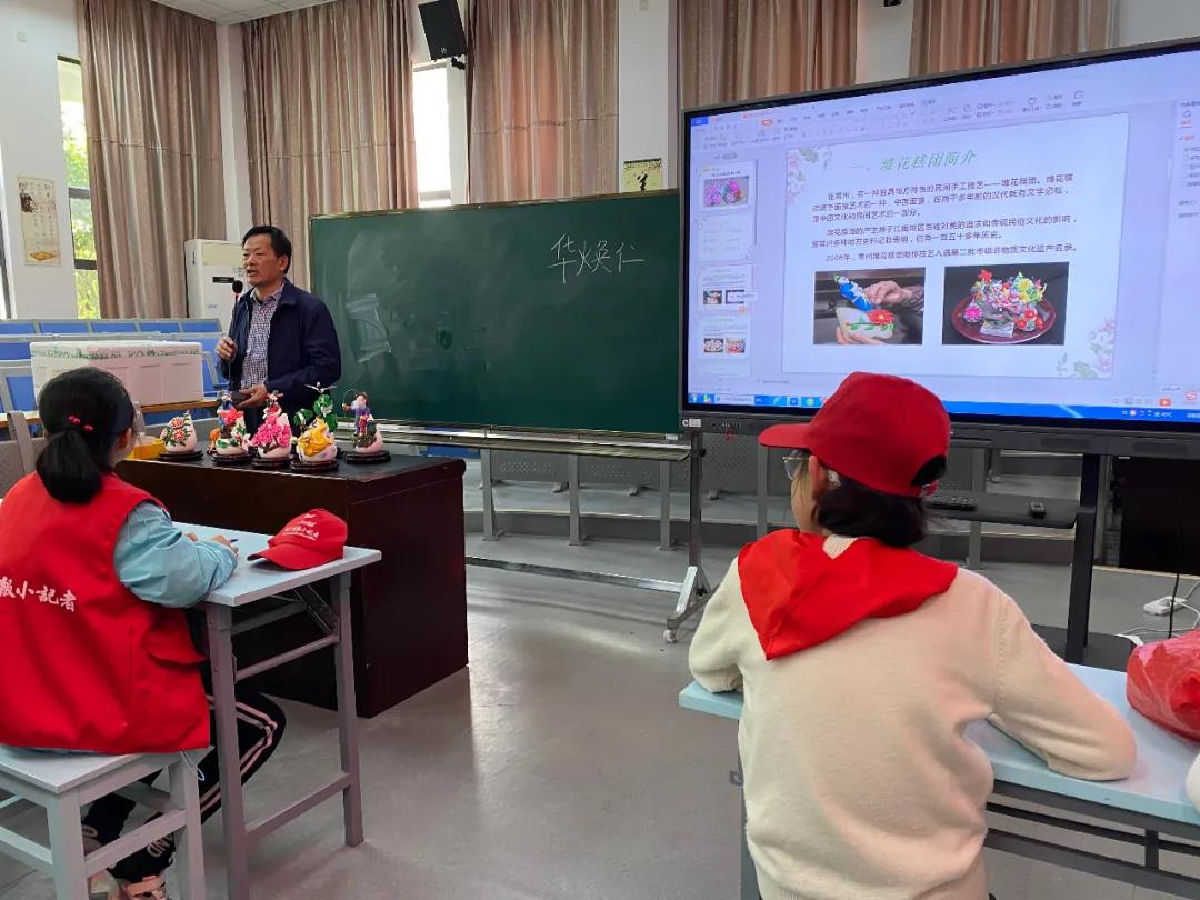 福禄寿禧、松鹤延年、龙凤呈祥、年年有余、麒麟送子……4月26日,在龙城小学一楼报告厅内,一批色彩鲜艳、造型生动的堆花糕团,展示在红木架子上,静静地向小记者们传递着吉祥的寓意,也在诉说着常州非遗文化的传承故事。