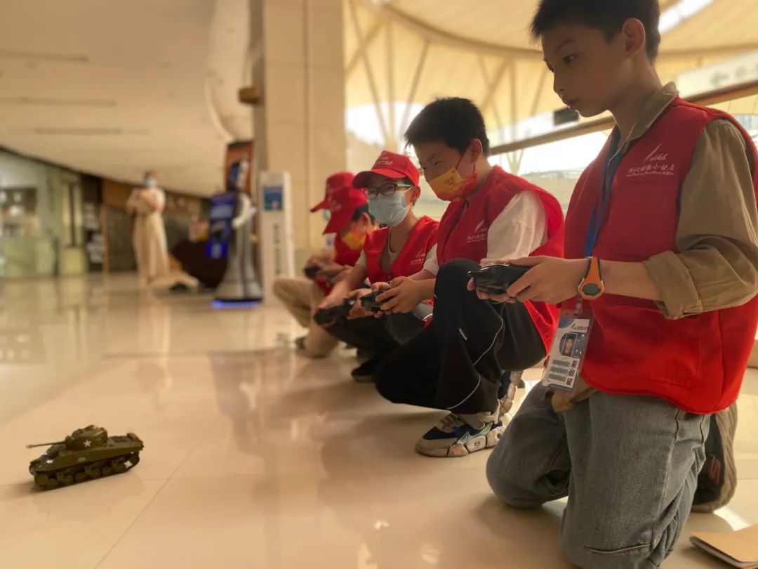 小记者纷纷走上自主搭建的赛场,小组成员进行任务分解,每一个少年心中的国防科技梦被点燃,大家启动手中遥控,团队协作开展坦克模型PK赛。
