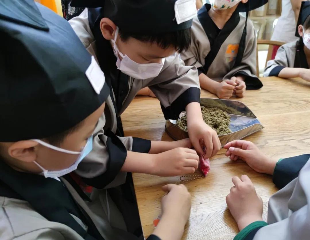 碾磨、灌装、缝制,在小记者们的双巧手下,一个个漂亮的中药香囊顺利诞生。