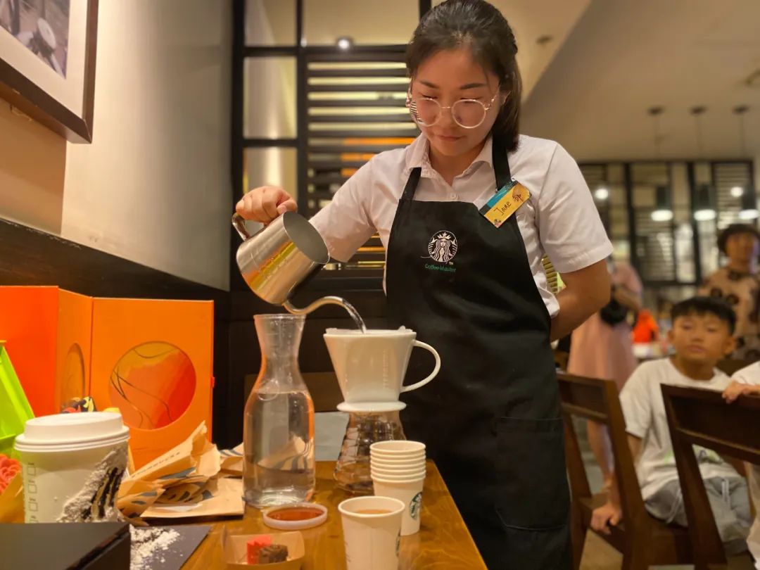 一走进星巴克,就闻到咖啡浓郁的香气,咖啡师先后向小记者讲解咖啡文化、介绍咖啡冲煮器具,示范滤纸、手冲壶等工具的使用方法,让小记者对咖啡文化有了初步的了解。