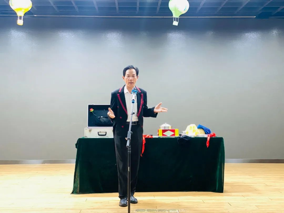 舞台上,只见蔡老师手拿一根看似普通的木棍,经过他神奇的手法,一眨眼就变成了一朵花,小记者们瞪大了眼睛,惊讶不已。