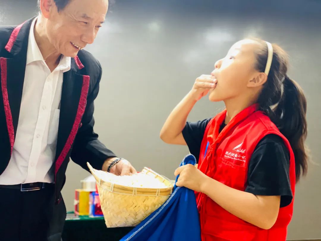 接着蔡老师又为大家带来了魔术——《传统五连环》,在蔡老师奇妙的手法下,一个个分散的环瞬间连在一起,蔡大师邀请小记者上台一起表演,大家跃跃欲试,白花花的大米在蔡老师和“小演员”的手中变成了爆米花,蔡老师又邀请“小助手”品尝又香又甜的爆米花。