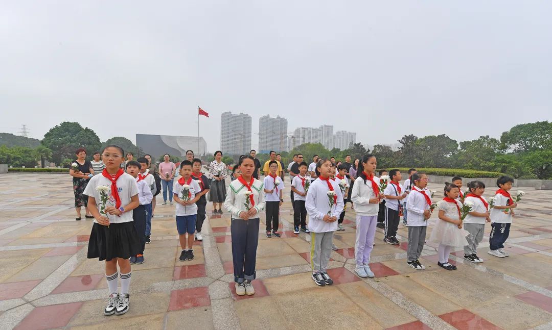 在升旗仪式之后,小记者和家长们纷纷来到了纪念碑前,现场奏唱国歌。随后,全场肃立,向为祖国和人民英勇献身的烈士默哀致敬。默哀毕,小记者们缓缓走向纪念碑,将献花整齐摆放到纪念碑基座上。