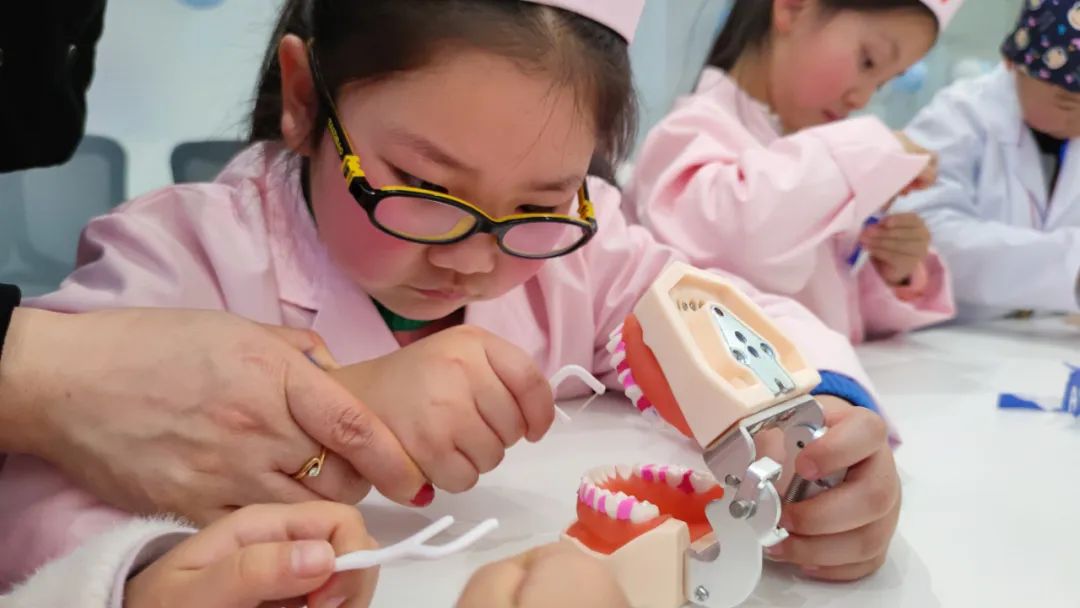 工作人员为小记者涂抹药剂,检测牙齿是否干净并通过教具学习如何正确使用牙线。
