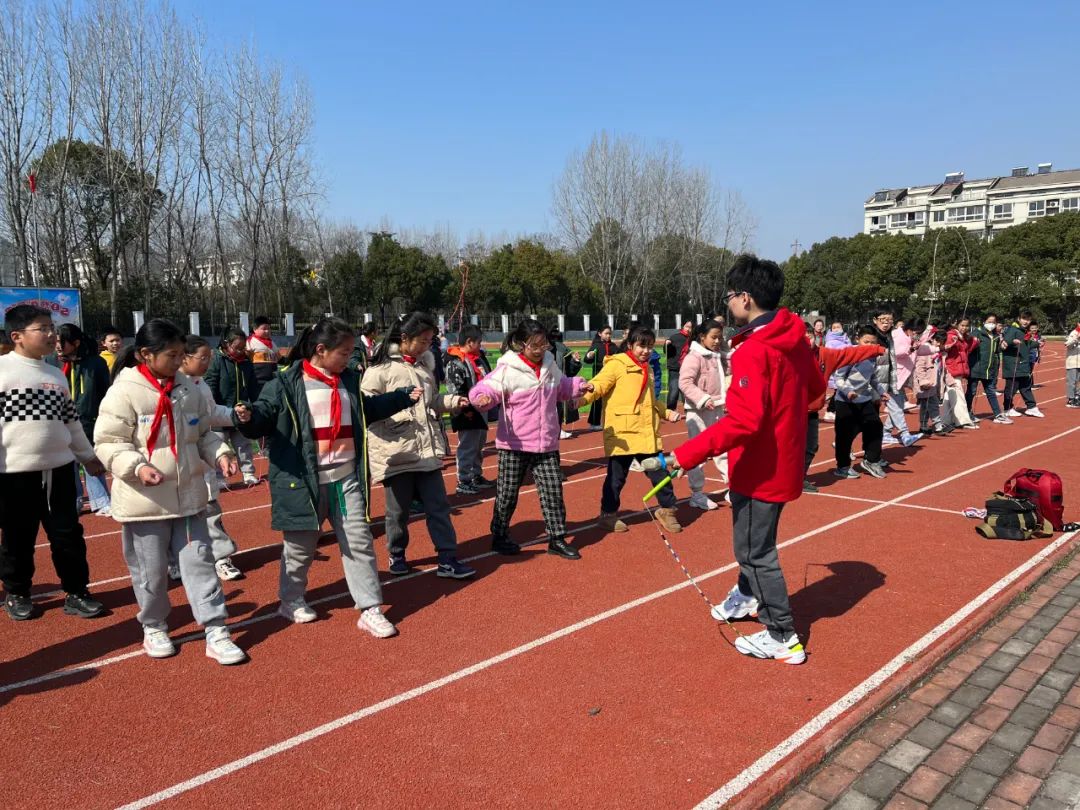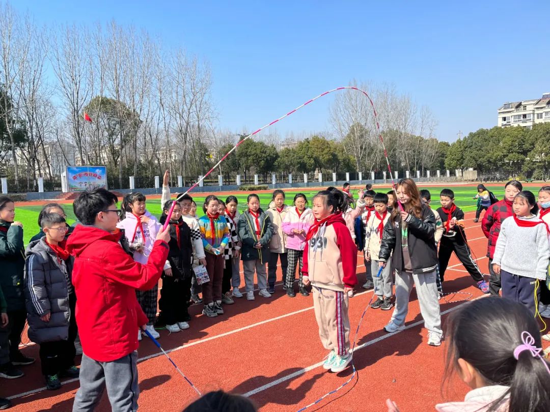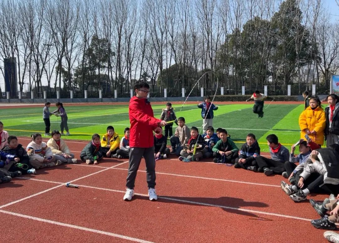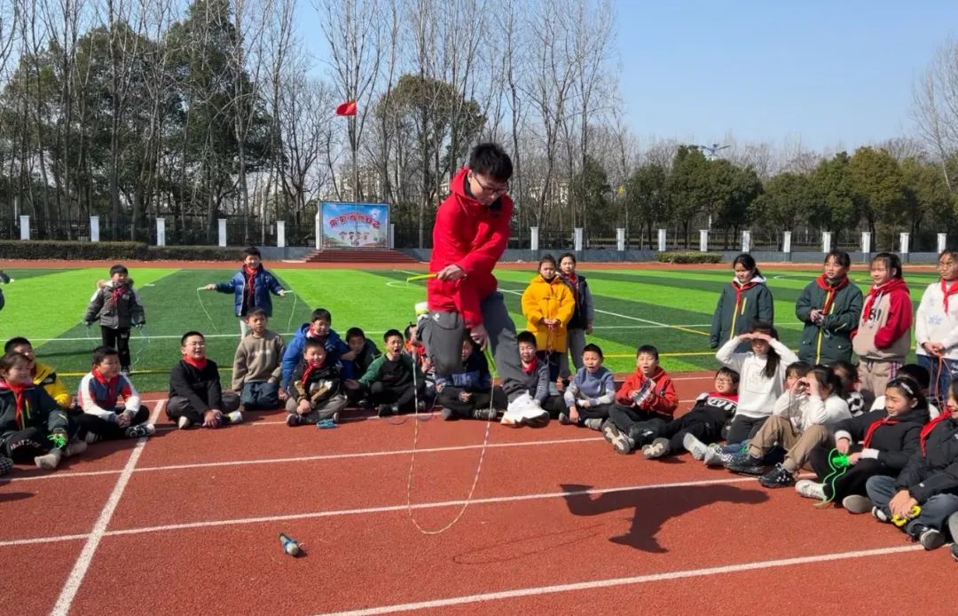 开合跳、双摇跳、交叉跳、俯卧撑跳……一根绳子,只要你想,就可以变幻跳出无数种花样,“哇……哇……好厉害……”同学们正眼睛一眨不眨地欣赏唐一超老师(个人花样跳绳全国冠军)秀绳技。