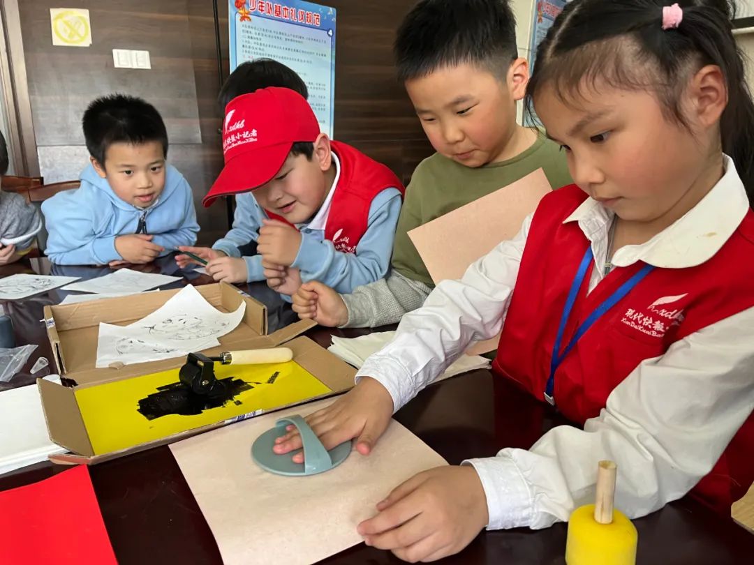 在杨老师的现场演示和指导下,孩子们有模有样地用墨辊蘸取黑色颜料在雕版上均匀滚动,再将宣纸轻轻覆盖在刷好的雕版上,一只手按住宣纸,另一只手拿海绵头,在纸上轻轻按压,使宣纸和雕版之间更贴合;然后用马莲在宣纸上轻轻的移动,让宣纸充分吸收油墨;最后揭开宣纸,作品就完成啦。