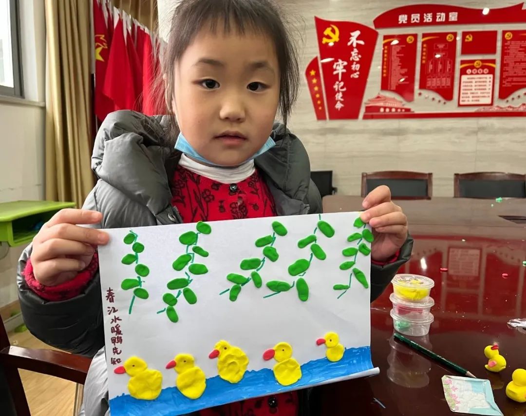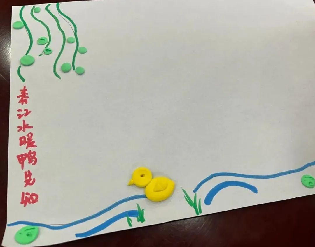 小记者们拿出准备好的素描纸、彩笔、彩色手工泥、水粉颜料等,发挥自己的想象和动手,完成了一幅幅可爱有趣的作品。有的用黄色手工泥做成小鸭子的模样,有的用蓝色蜡笔绘制早春回暖的江水,还有的用手指蘸取绿色的颜料,轻轻的按在柳枝上就变成了柳叶。