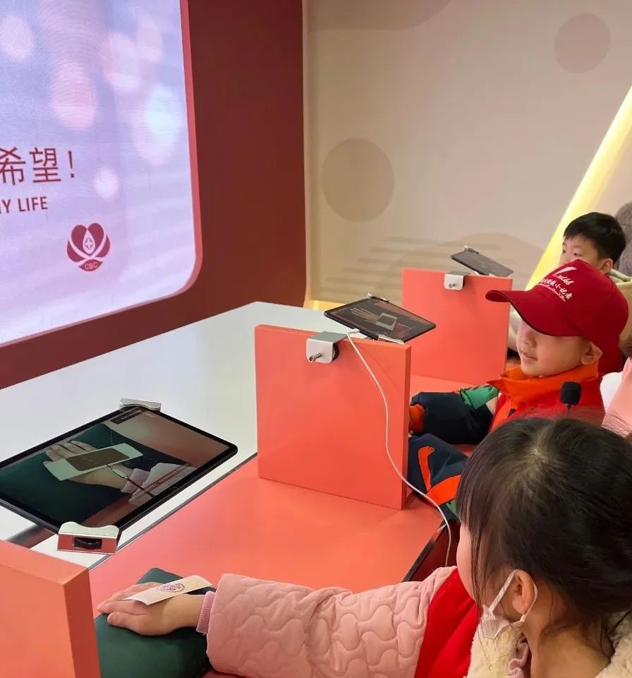 在血液科普教育基地,除了传统的图文、视频的展示,还能通过模拟操演、互动问答等手段,让小记者们在寓教于乐中学习相关知识。