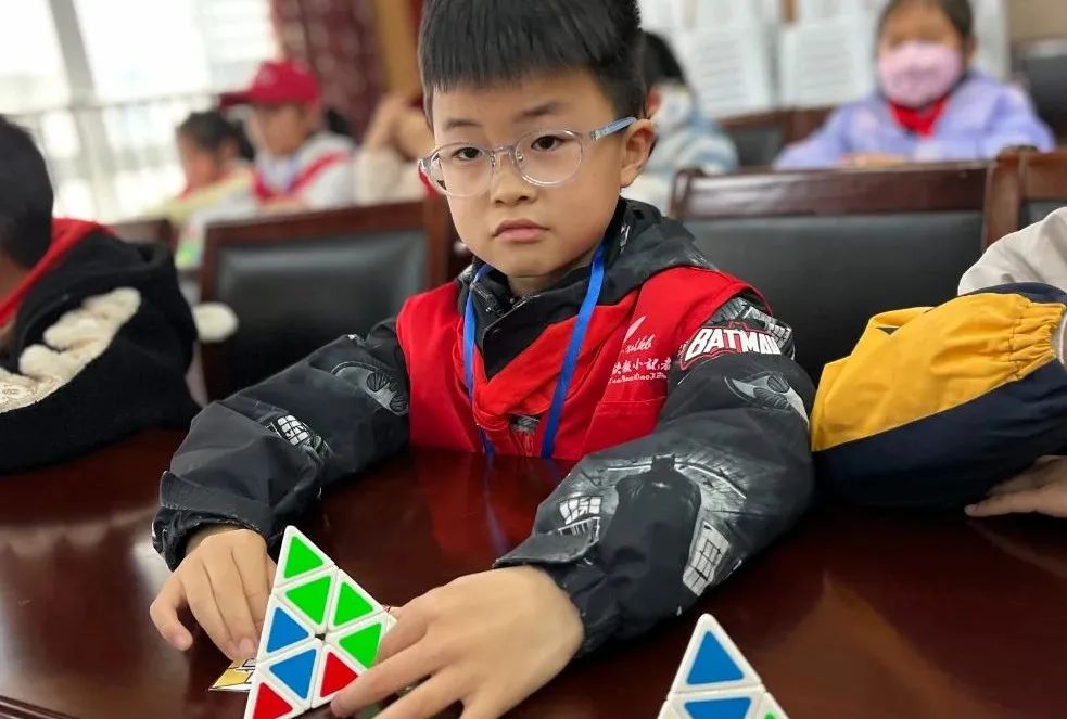 老师们将金字塔魔方分发到每位小记者手中,讲解完基础还原魔方的方法,就到小记者动手体验的时间啦。“老师老师,看我做的对吗?”小记者们纷纷邀请查老师指导。