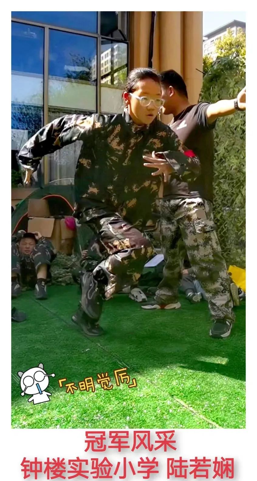 热身活动之后,期待已久的越障赛跑开始了。教官现身说法,示范了匍匐前进,S形穿插等基本战术动作。小记者们以斗志昂扬的姿态进行了一番速度与协调性的较量,来自钟楼实验小学的小记者陆若娴以47秒的好成绩勇夺第一!
